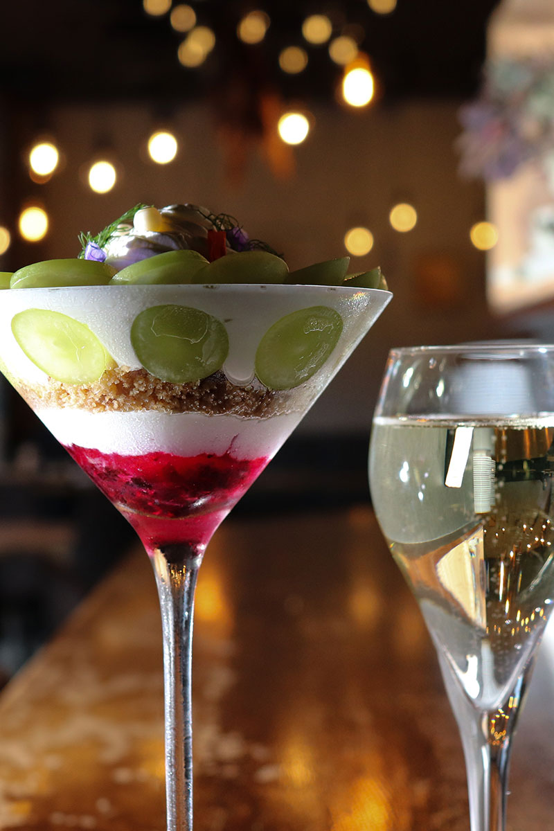 〆パフェとして、お食事やお酒の後に食べていただくことを前提として考案しているため、クリームなどをコテコテに使う伝統的なパフェとは一線を画す味わいとなっています。 瑞々しいフルーツを使用し、重すぎない味わいが特徴で、お酒とペアリングしながらお楽しみ頂けます。