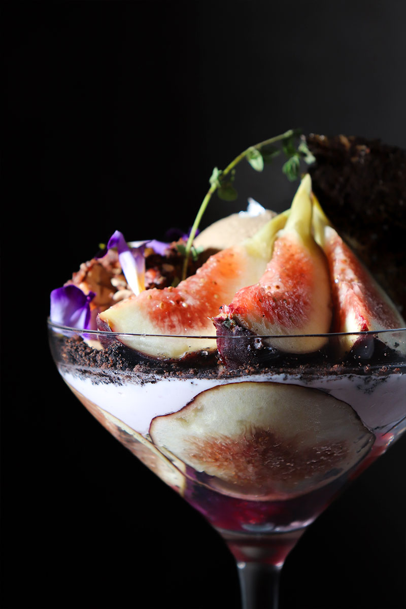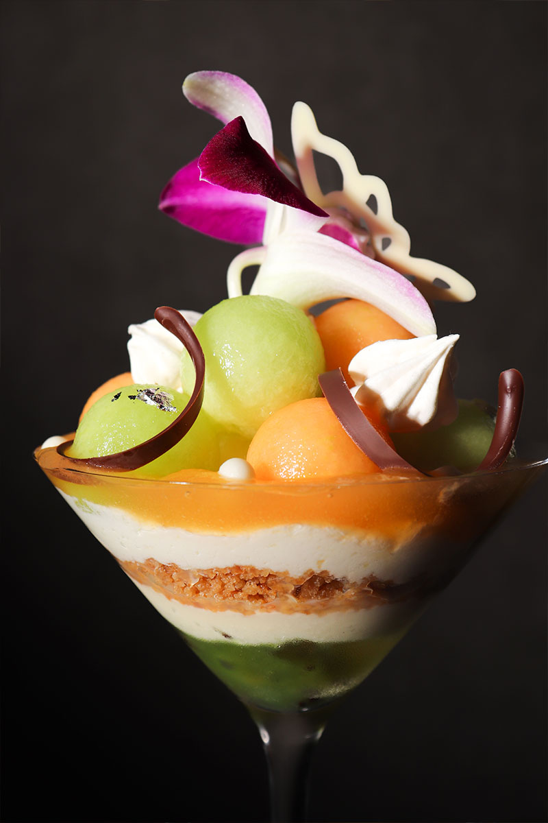 〆パフェとして、お食事やお酒の後に食べていただくことを前提として考案しているため、クリームなどをコテコテに使う伝統的なパフェとは一線を画す味わいとなっています。 瑞々しいフルーツを使用し、重すぎない味わいが特徴で、お酒とペアリングしながらお楽しみ頂けます。